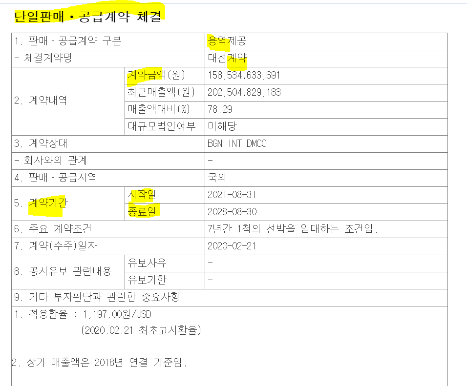 2. 계약금액뿐 아니라 계약기간도 살펴야합니다. 일반적인 기업의 매출 인식 방법은 고객에게 판매하는 시점에 매출로 반영되는 방법이지만 건설과 조선업은 진행률 방식으로 매출을 인식합니다. 100억원규모의 공사계약을 체결하고 예상 공사기간이 3년인 경우, 1년차에 30% 공사가 진행되었다면 해당 연도 매출은 30억원이 반영됩니다. 이처럼 계약기간이 길다면 공시의 효과가 크지 않을 수 있으며 공사가 진행되다가 중지되는 경우도 있습니다.
